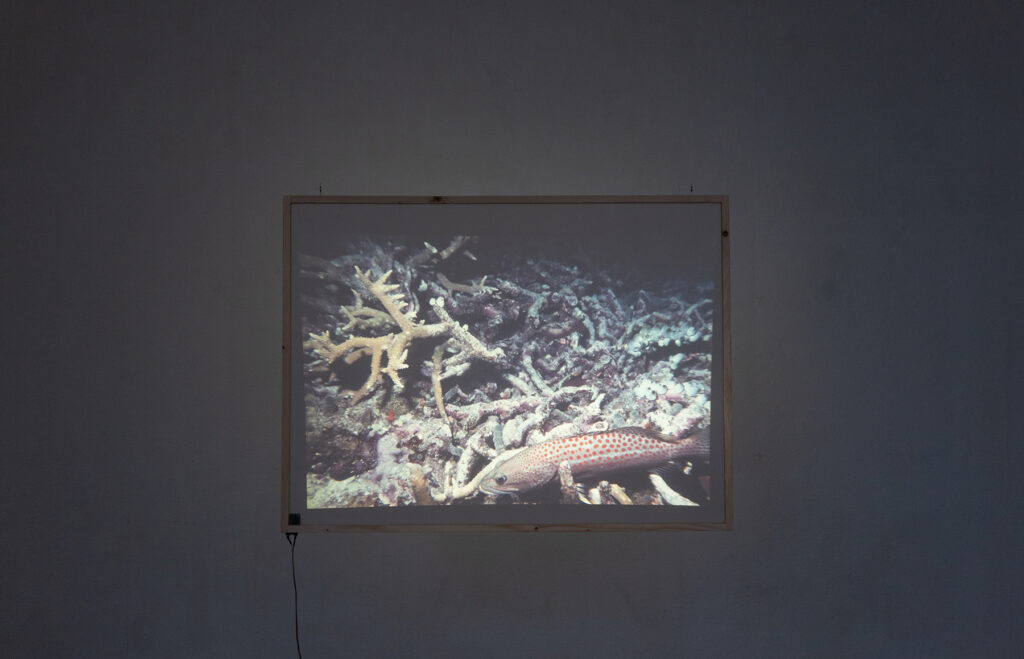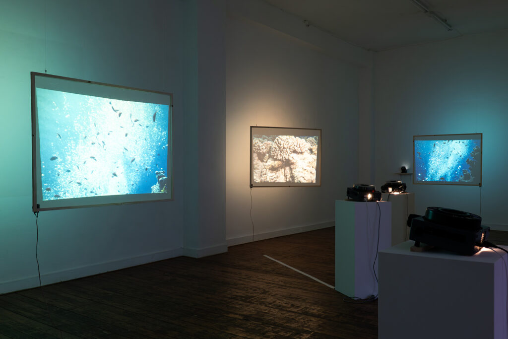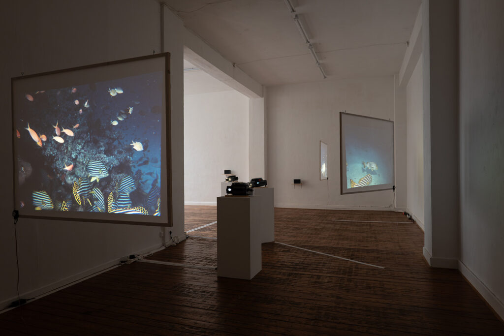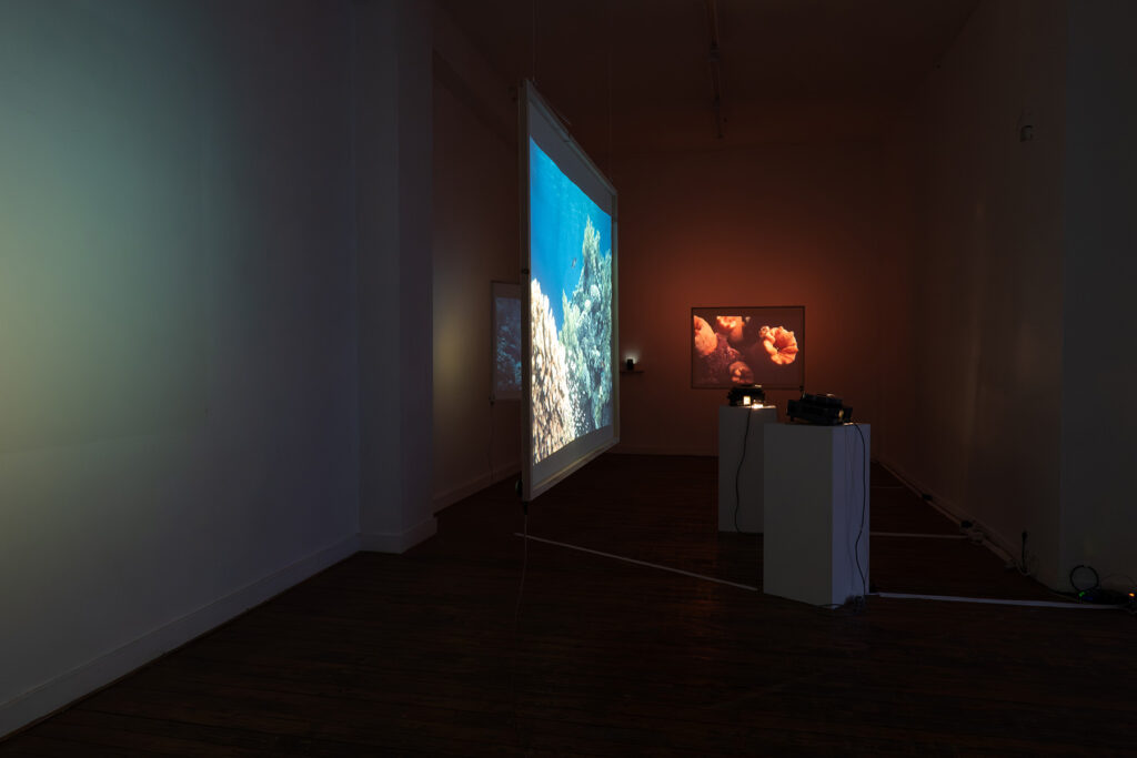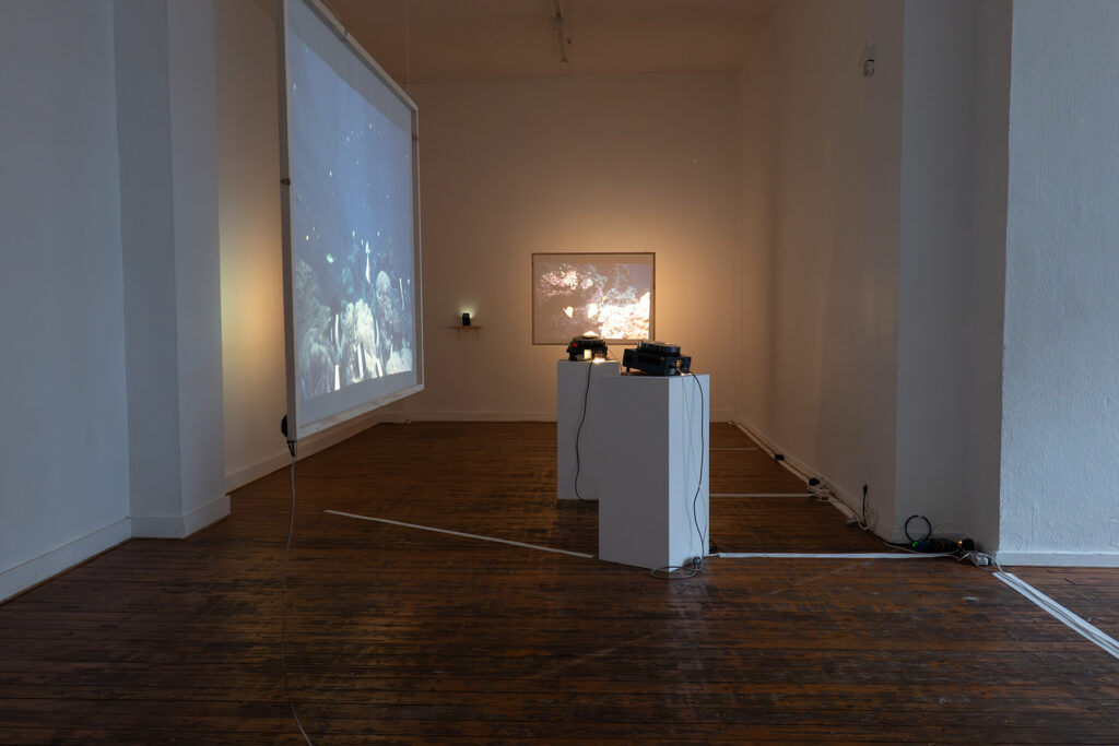 8 Kisten voller Dias und hunderte weitere Unterwasseraufnahmen bilden die Grundlage dieser Ausstellung. Jannika Lösche verwebt die Bilder aus dem Nachlass ihres Großvaters, einem Hobbytaucher, der in zwei Reisen auf die Malediven und ans Rote Meer die Mehrheit der Bilder aufgenommen hat, mit ihrer eigenen künstlerischen Praxis. Die Arbeit bringt eine Soundarbeit mit den Fotografien in einer Installation zusammen. Die Bilder verflechten sich mit der Soundkomposition, die den Ausstellungsraum einnimmt. Dabei zeigen sie Korallen, Fische und Unterwasserlandschaften in verschiedensten Formen und Farben.